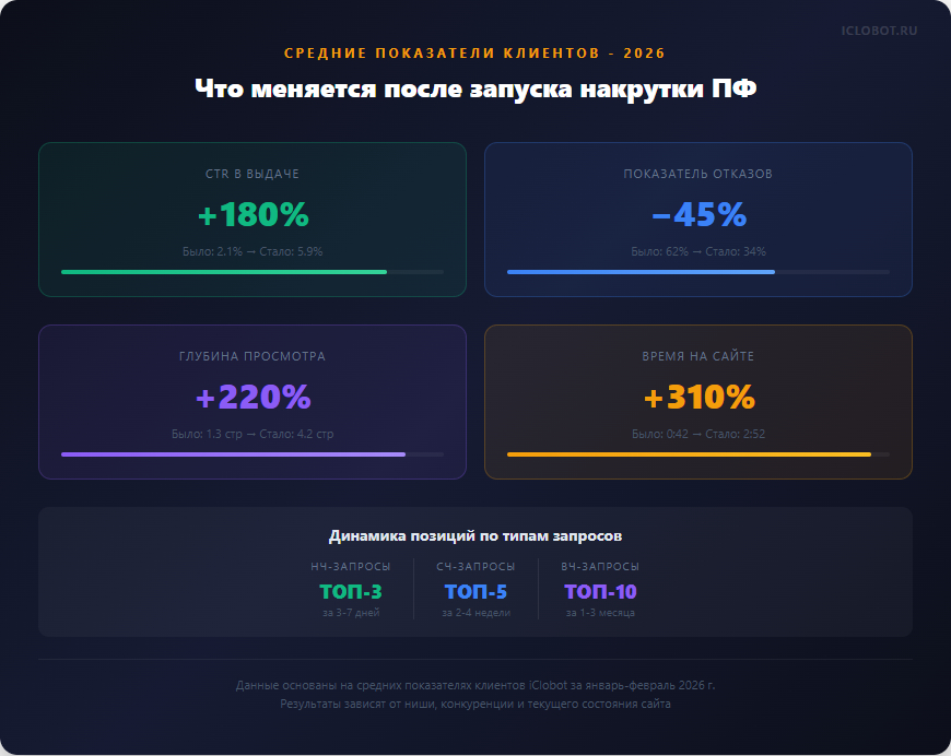 Важно понимать: скорость зависит от множества факторов - конкурентности ниши, текущих позиций сайта, его технического состояния, качества контента. Если сайт таких позиций не имеет, то рекомендуем выполнить SEO-оптимизацию! Накрутка ПФ - это усилитель, а не волшебная таблетка. Если сайт технически нерабочий, с ошибками индексации и нулевой оптимизацией - сначала нужно привести его в порядок.