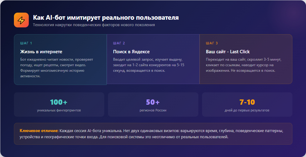 Как это работает на практике? Представьте AI-бота, у которого есть своя «цифровая жизнь». Он не просто механически кликает по ссылкам. AI-бот имеет поведенческий фактор как у настоящего человека: он ежедневно совершает различные действия в интернете - читает новости, смотрит погоду, вводит различные запросы - так же, как и мы с вами.