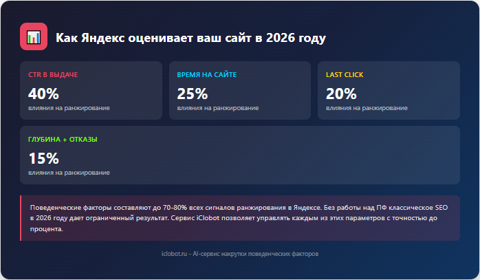 В 2026 году Яндекс использует нейросетевые алгоритмы для анализа поведения миллиардов пользовательских сессий. Он буквально «видит», какие сайты удовлетворяют пользователей, а какие - нет. Именно поэтому классическое SEO (текстовая оптимизация, ссылочная масса) без работы над поведенческими факторами уже не дает прежних результатов.