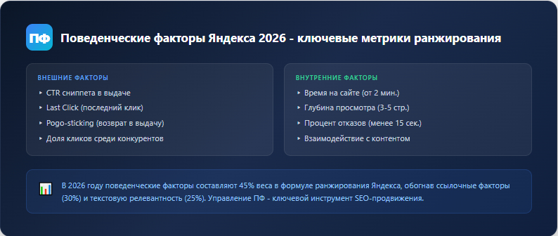 В 2026 году поведенческие факторы остаются основным сигналом ранжирования в Яндексе. Алгоритмы анализируют не просто клик по сайту, а всю сессию пользователя: вернулся ли он в выдачу, сколько времени провел на странице, перешел ли по внутренним ссылкам.