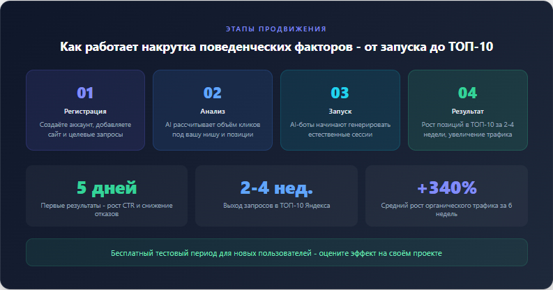 Зарегистрируйтесь в личном кабинете. Добавьте сайт и укажите целевые поисковые фразы. Система автоматически рассчитает нужное число кликов. Пополните баланс и запустите кампанию. Для новых пользователей доступен бесплатный тест-драйв - оцените эффект без риска! Совет: начните с 3-5 низкочастотных запросов - так вы быстрее увидите результат и сможете масштабироваться.