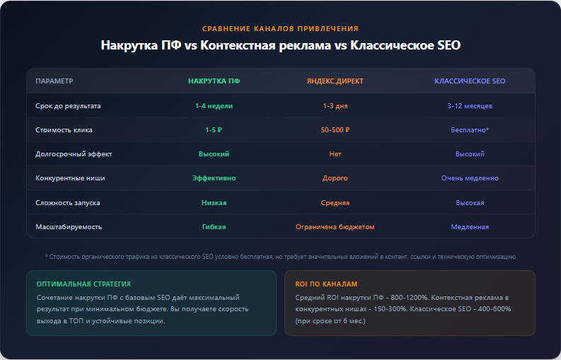 При этом ROI (возврат инвестиций) от накрутки ПФ обычно значительно выше, чем от контекстной рекламы. Если стоимость одного клика в Яндекс.Директ по коммерческому запросу может составлять 100-500 рублей, то клик из органической выдачи, полученный благодаря улучшению позиций, обходится в разы дешевле.