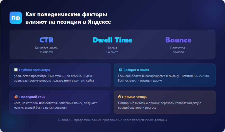 Поведенческие факторы в SEO - это сигналы, которые показывают поисковым системам, как пользователи взаимодействуют с сайтом. Это не абстрактная метрика - это конкретный набор данных, который Яндекс собирает с каждого визита на каждый сайт.