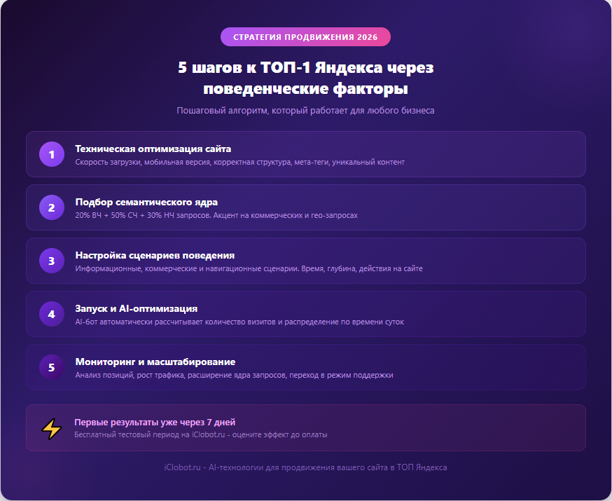 Продвижение сайтов через поведенческие факторы - это не временный тренд и не хитрость. Это основной инструмент конкурентной борьбы в поисковой выдаче 2026 года. Компании, которые начали использовать его раньше, уже получают стабильный органический трафик и экономят сотни тысяч рублей на контекстной рекламе.
