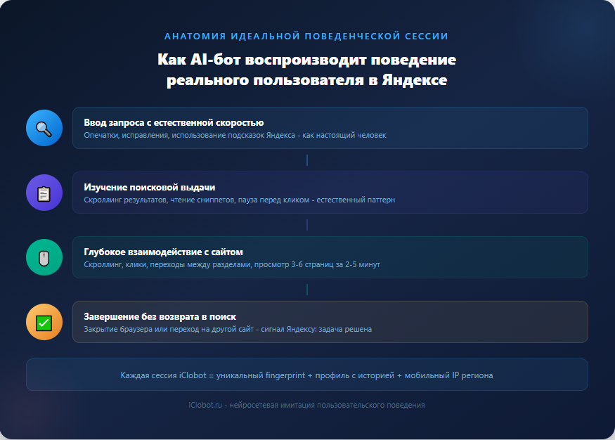 Чтобы глубже понять, как работает накрутка поведенческих факторов, давайте разберем, как выглядит «идеальная» пользовательская сессия с точки зрения алгоритмов Яндекса. Это не теория - это реконструкция на основе анализа тысяч успешных SEO-кампаний.
