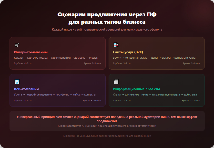 Универсального рецепта не существует. Стратегия продвижения через поведенческие факторы должна учитывать специфику бизнеса, конкурентную среду и особенности целевой аудитории. Рассмотрим проверенные сценарии для основных типов бизнеса.