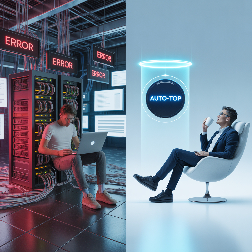 Визуализация контраст между стрессом ручной настройки и расслабленностью автоматизации.