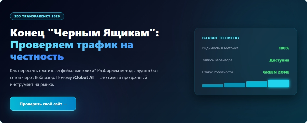 В этом обзоре разберем, как самостоятельно проверить качество трафика, почему нельзя верить красивым отчетам в PDF, и как экосистема iClobot сделала ставку на 100% прозрачность в Метрике клиента.