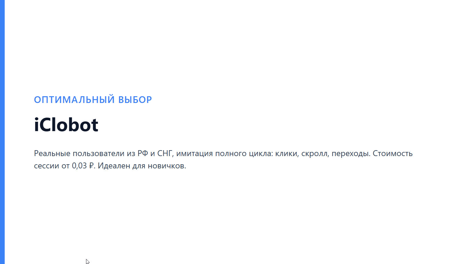 Мой личный опыт: Я использовал iClobot для продвижения своего блога по SEO. Результаты не заставили себя ждать: позиции по низкочастотным запросам выросли на 10-15 пунктов за пару недель. Сервис идеально подходит для мягкого старта без риска получить бан.