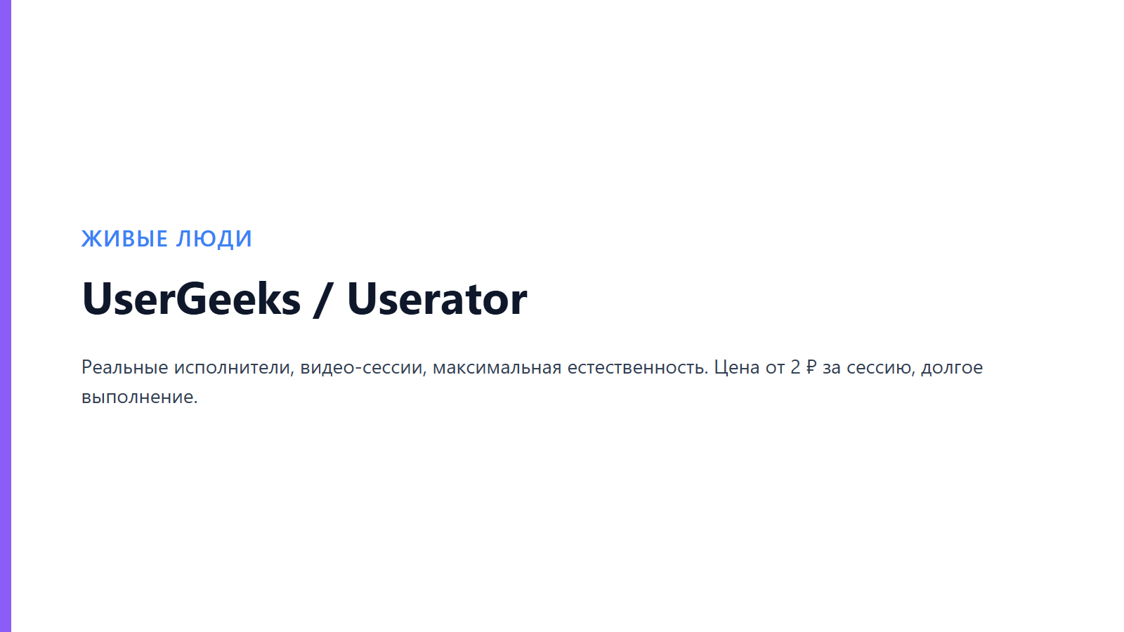 Минусы: Высокая стоимость сессии (от 2 рублей), выполнение заказа может занимать дни, сложнее контролировать показатель отказов. Подходит для высокобюджетных проектов.
