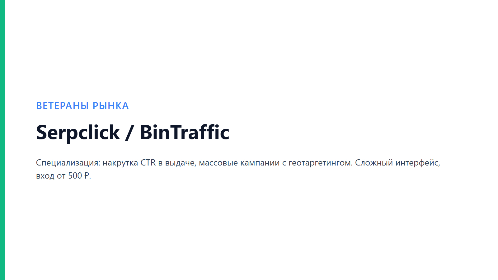 В эту категорию попадают проверенные ветераны рынка. Serpclick известен своей специализацией на накрутке CTR в выдаче поисковых систем, что особенно важно для роста трафика. BinTraffic предлагает мощный функционал для массовой накрутки ПФ с геотаргетингом.