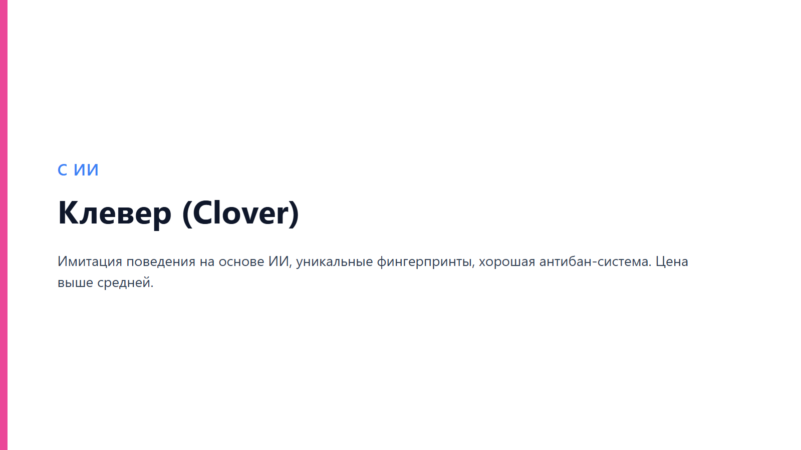 Плюсы: Современный подход, хорошая антибан-система, удобные отчеты.