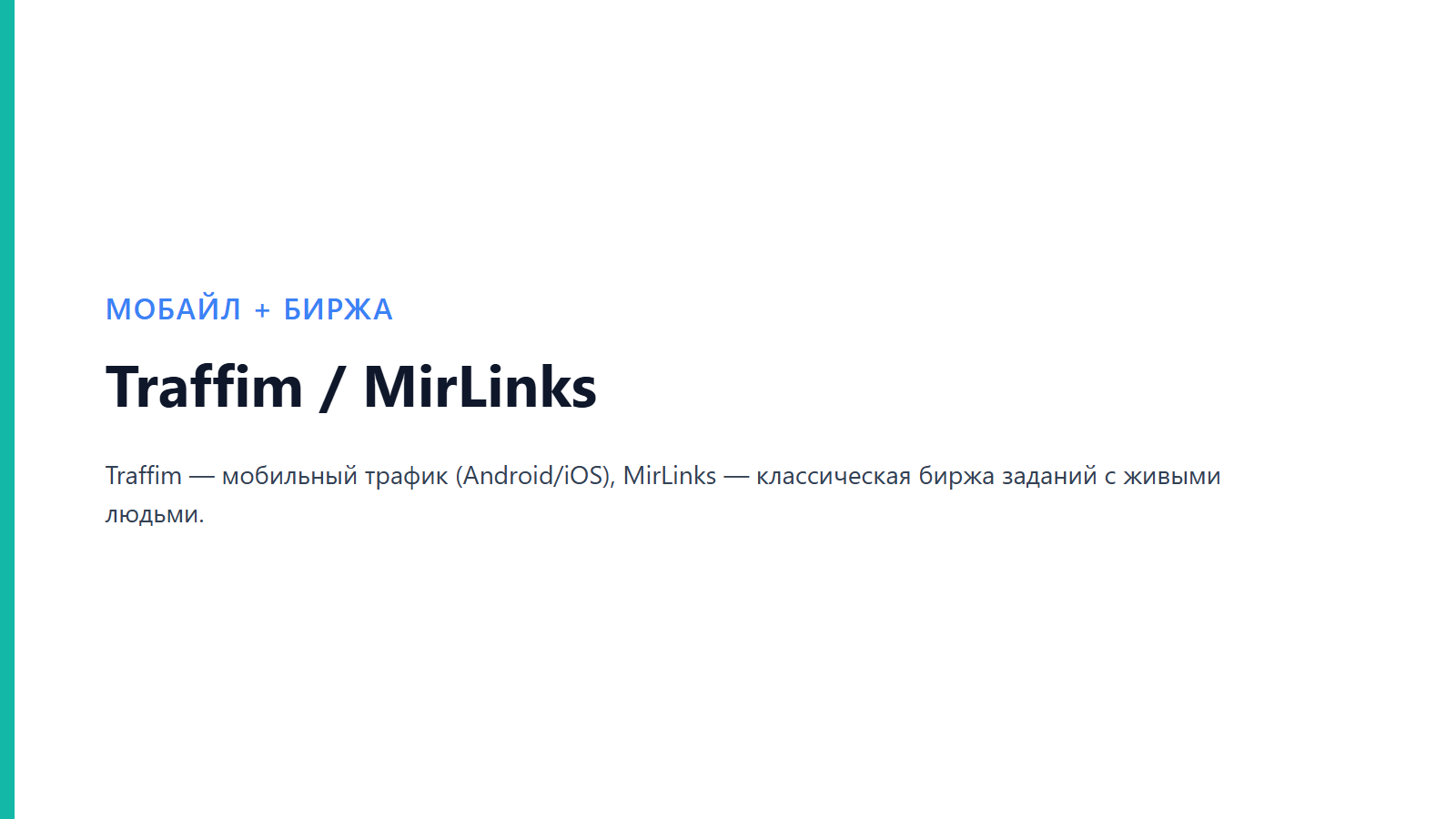 Traffim специализируется на мобильном трафике (Android/iOS), что критически важно в эпоху Mobile First. Эмуляция свайпов и касаний делает его отличным выбором для адаптивных сайтов. MirLinks — классическая биржа заданий с огромной аудиторией, которая дает очень «живой» трафик, но требует четких формулировок заданий.
