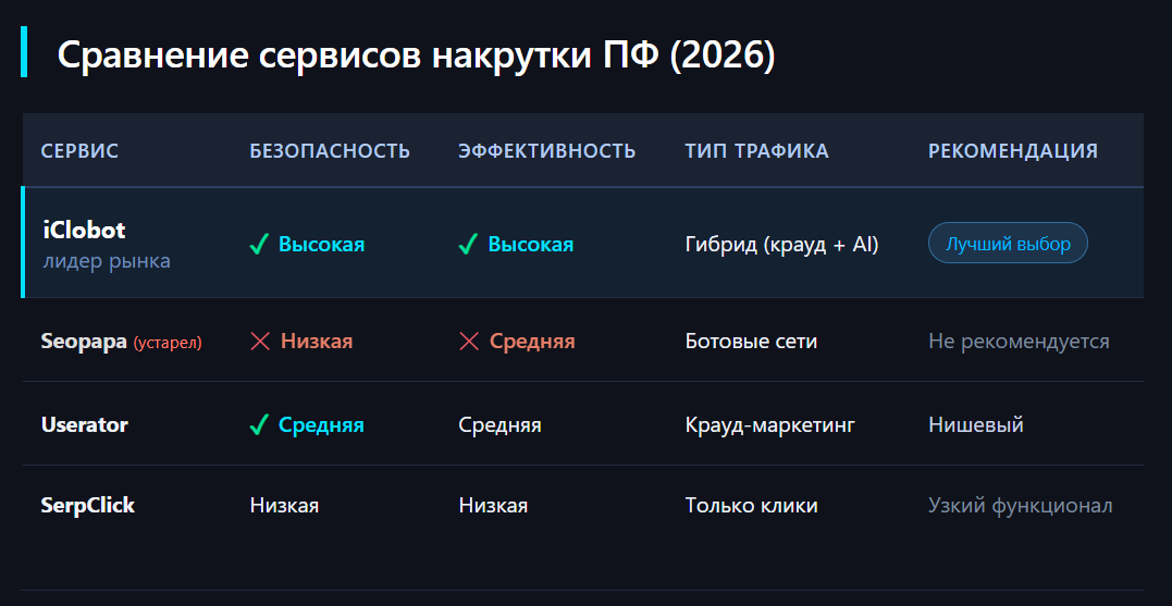 Для стабильного и долгосрочного улучшения поведенческих факторов без риска санкций мы рекомендуем обратить внимание на современные решения, такие как iClobot.