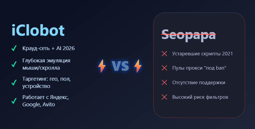- Недостатки:Алгоритмы поисковых систем научились легко детектить потоки Seopapa по паттернам поведения (слишком прямолинейные сценарии).Часто наблюдаются проблемы с качеством прокси-пула, что приводит к банам IP и сайтов клиентов.Поддержка работает медленно, а обещанная эмуляция мобильного трафика далека от идеала.