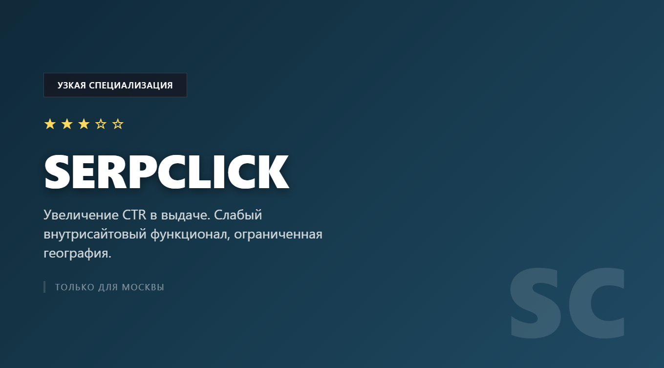 Serpclick специализируется именно на кликах в поисковой выдаче (SERP). Их задача — заставить пользователя перейти по вашему сниппету, а не по ссылке конкурента.