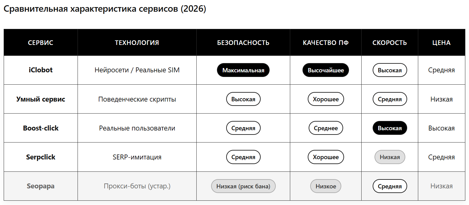 Если ранжировать сервисы по критериям «качество/безопасность/цена», то iClobot занимает первую строчку с большим отрывом. В 2026 году это не просто сервис накрутки, а полноценная экосистема для управления репутацией и трафиком.