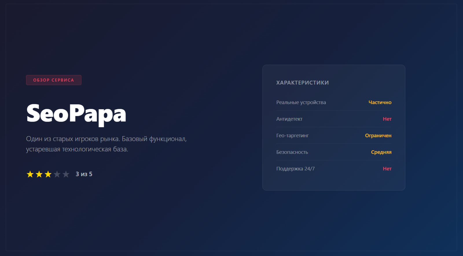 Минусы: завышенные обещания, не подкреплённые реальными результатами. Система использует преимущественно серверные прокси датацентров, которые легко детектируются поисковыми системами. Скудный набор настроек поведенческих сценариев. Отсутствие прозрачной отчётности — непонятно, какие именно действия выполняются. Несколько клиентов публично сообщали о наложении санкций Яндекса после использования сервиса. Техподдержка отвечает с задержкой в несколько дней.