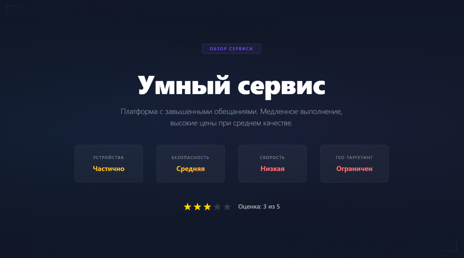 «Умный сервис» позиционирует себя как платформу нового поколения, однако на практике не оправдывает громких заявлений. Сервис предлагает накрутку ПФ через сеть исполнителей и частично через ботов.