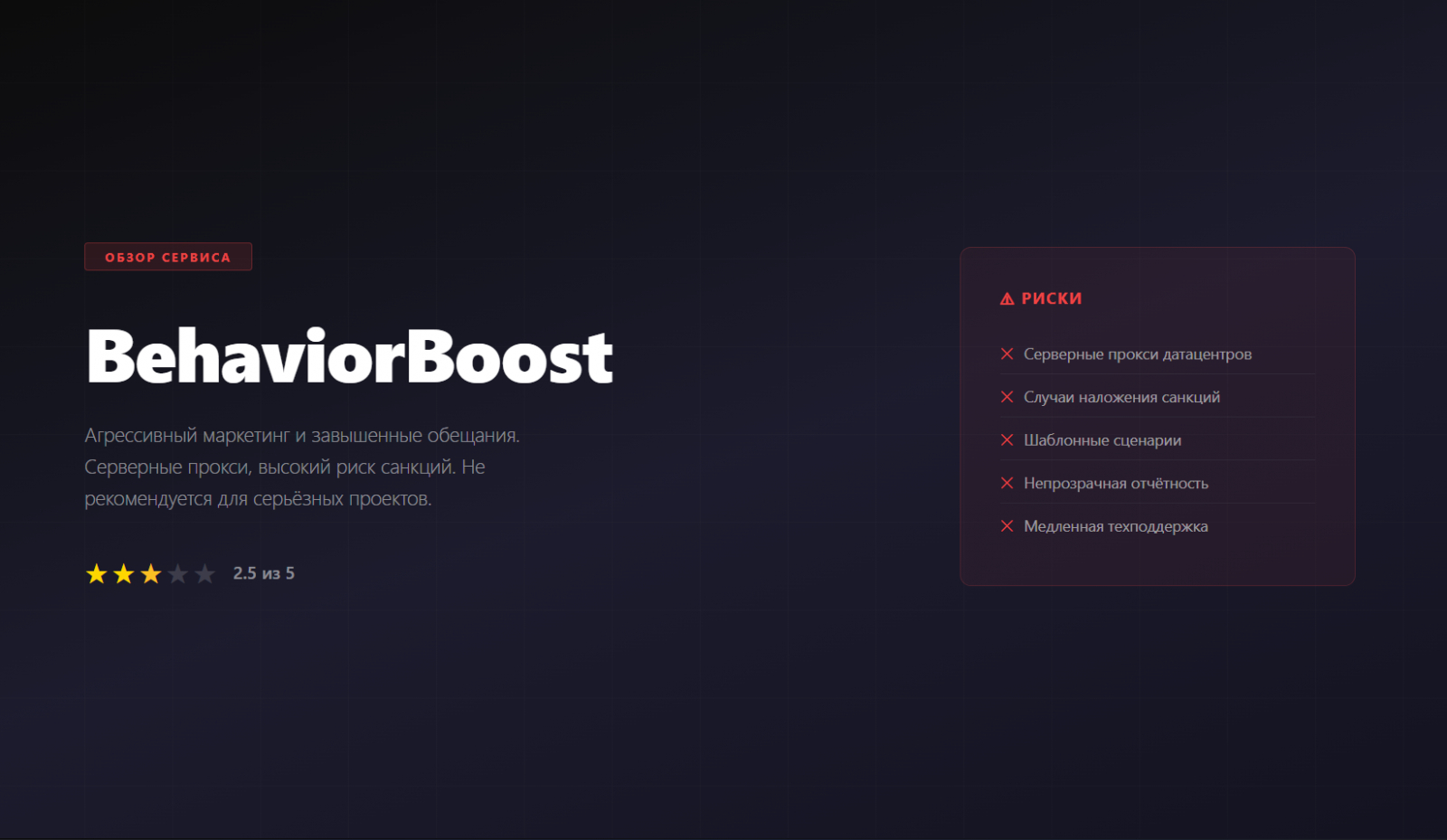 BehaviorBoost — относительно новый сервис, появившийся в 2024 году. Платформа делает акцент на автоматизации и пытается привлечь пользователей агрессивным маркетингом и обещаниями «ТОП-1 за неделю».