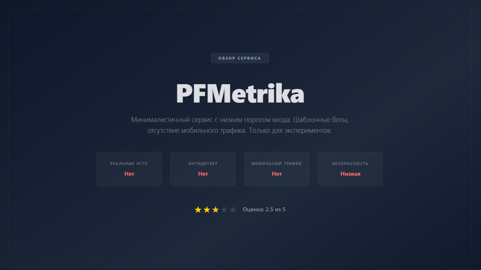 Минусы: качество трафика оставляет желать лучшего — паттерны поведения ботов шаблонны и легко распознаются алгоритмами. Отсутствие продвинутого гео-таргетинга — доступны только крупные города. Нет мобильного трафика. Аналитика ограничена базовыми метриками. Фактически PFMetrika подходит только для экспериментов с малозначимыми проектами, но для серьёзного продвижения абсолютно непригодна.