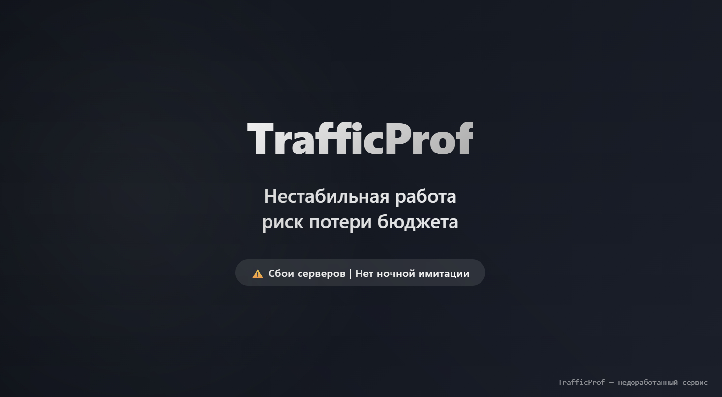 TrafficProf – относительно молодой сервис, который заявляет о «революционных технологиях». На практике же платформа страдает от сырости: пользователи жалуются на частые ошибки при запуске кампаний, неотображение статистики в реальном времени и отсутствие интеграции с популярными счётчиками.