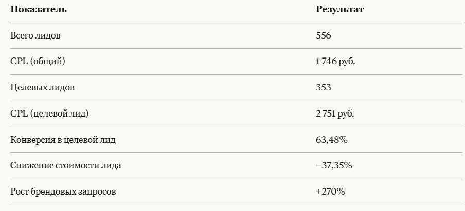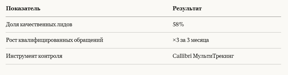 Ключевой вывод из этого кейса: стоимость лида снизилась не за счёт урезания бюджета, а за счёт роста доли целевых обращений. Когда реклама работает на нужную аудиторию — количество мусорных заявок падает, а CPL целевого лида снижается сам.