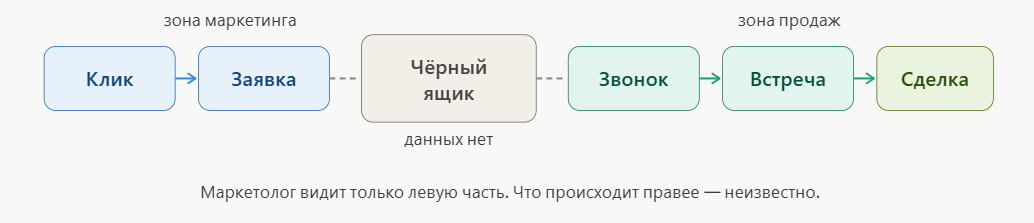 Маркетинг отчитывается за лиды и CPL. Продажи — за выручку и закрытые сделки. Между этими двумя мирами нет общих данных. Каждый смотрит в свой отчёт и видит свою правду.