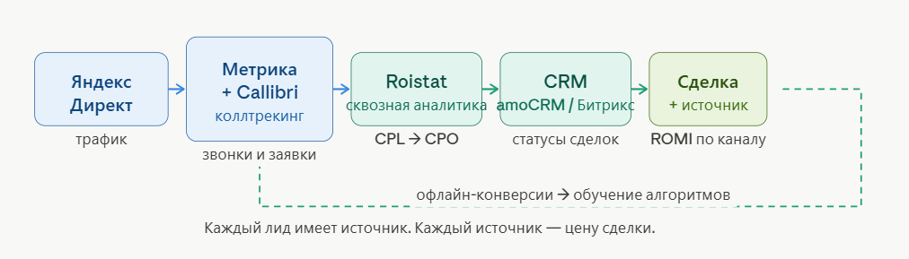Принцип простой: каждый лид получает источник, каждый источник — цену сделки. Система связывает клик на объявление с записью в CRM, а CRM — с закрытой сделкой.
