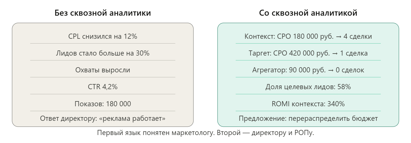 Маркетолог перестаёт видеть «500 заявок». Он начинает видеть: 3 сделки пришли из контекста, 1 — из таргета, 0 — из агрегатора. Контекст дал CPO 180 000 рублей, таргет — 420 000. Агрегатор потратил 90 000 и не дал ни одной.