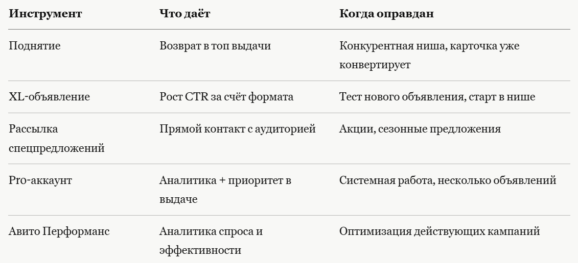 Авито предлагает несколько инструментов платного продвижения. Ключевое правило: они работают только поверх правильно упакованной карточки.