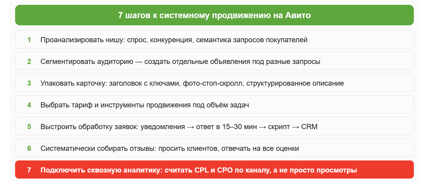 Ошибка, которую делают многие: Авито рассматривается как отдельный инструмент. Разместили объявления, получили заявки — и дальше непонятно, что с ними происходит.