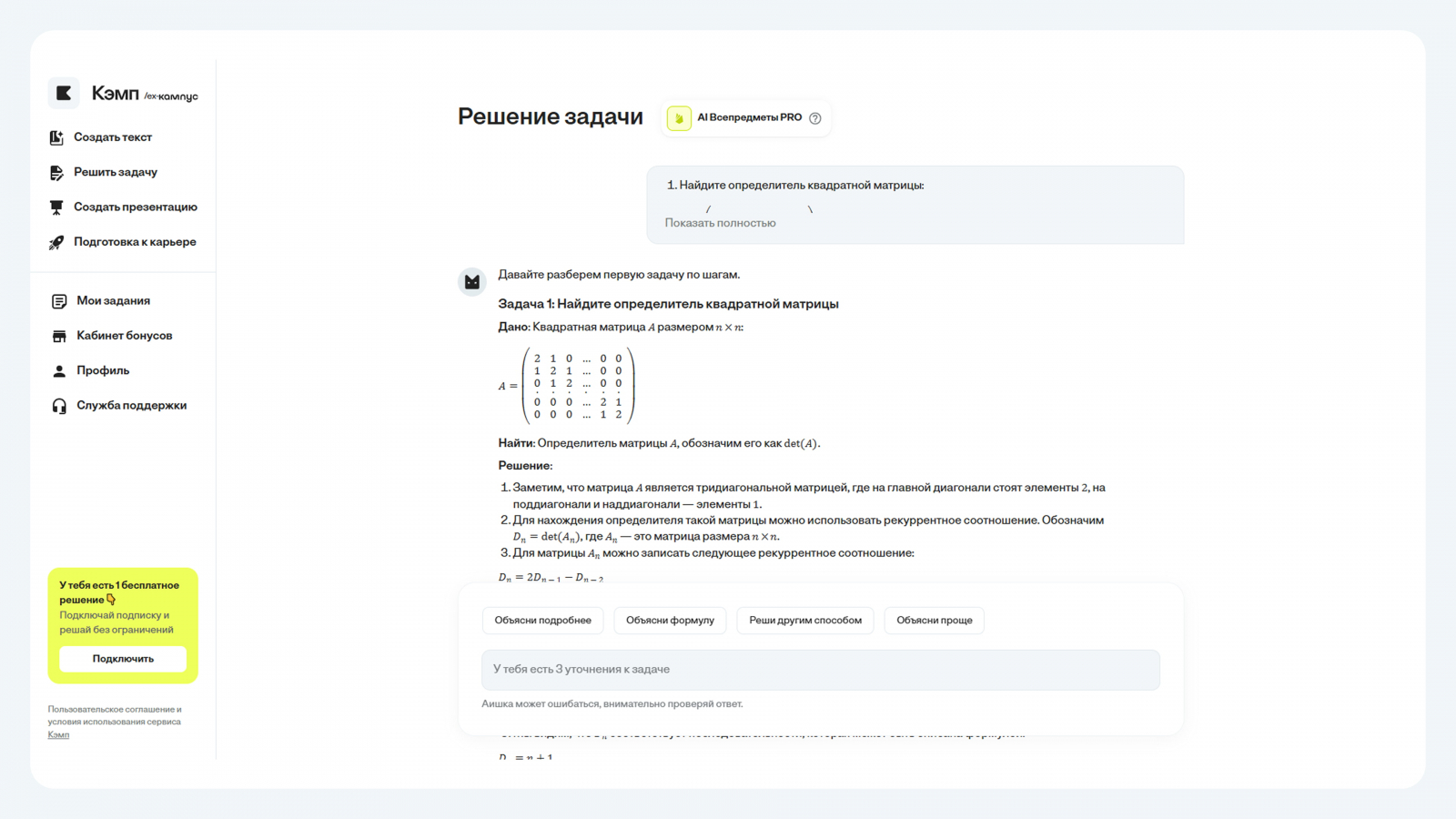 Это образовательная ИИ-платформа, которая сочетает в себе распознавание текста и формул с функцией детального объяснения этапов и логики выполнения задания. Можно загружать отсканированные страницы из учебников, записи из тетрадей или даже фото классной доски – нейросеть решит задачу по фото онлайн и даст развернутый комментарий своих действий.