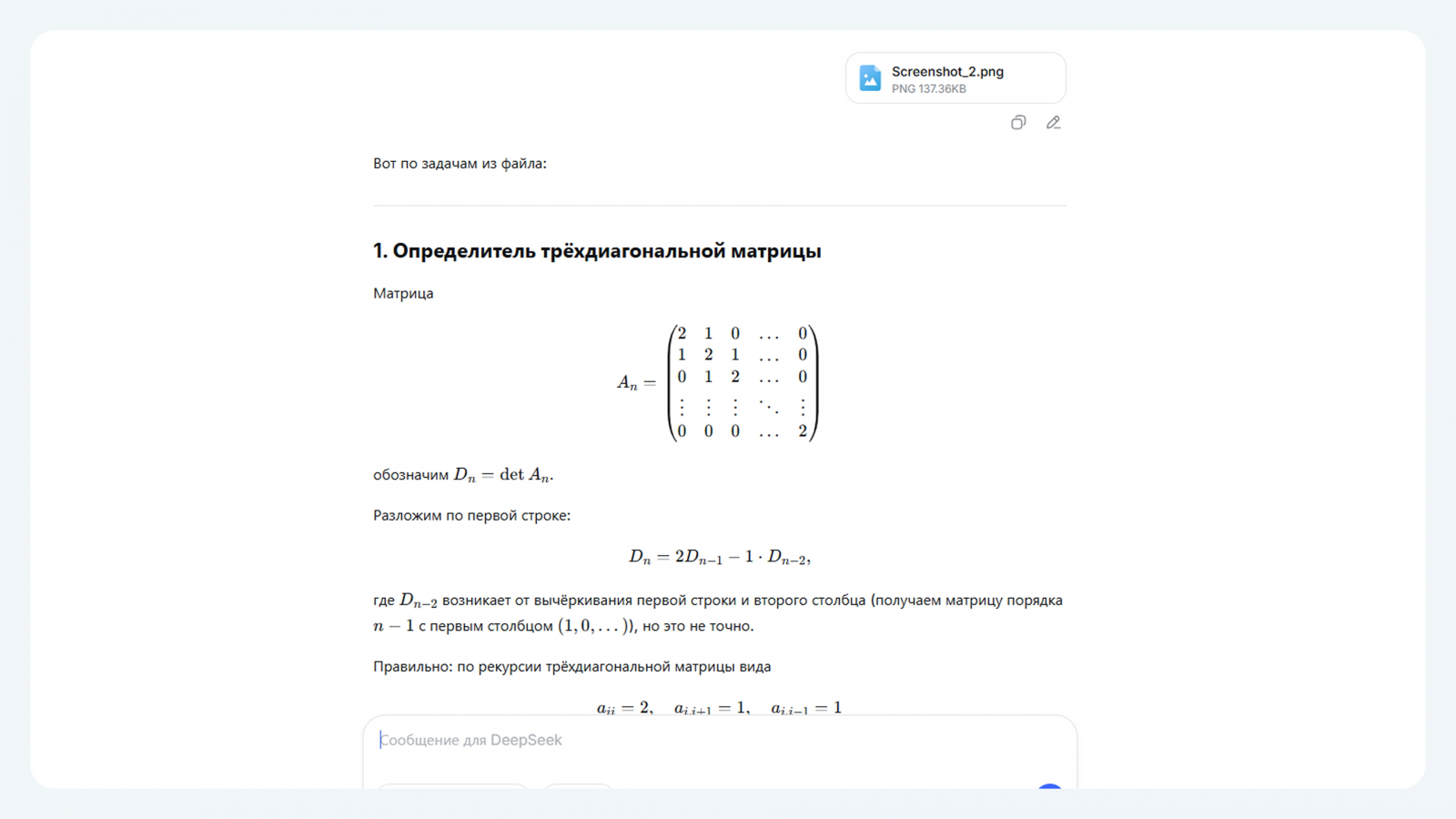ИИ-ассистенты справляются с решением задач по фото онлайн различных уровней сложности – от самых простых школьных до университетских, и возможности нейросетей продолжают развиваться. Вот лишь несколько примеров того, с чем они помогают: