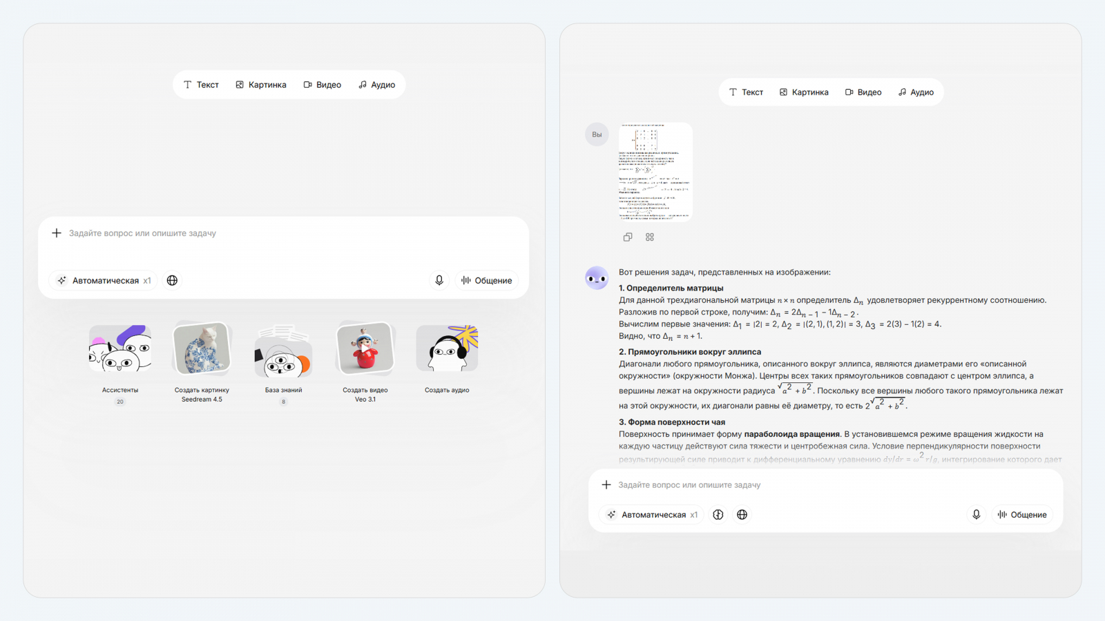 Если вам нужно решить задачу по картинке нейросетью, то этот ИИ-чат способен «считывать» текст со снимков, глубоко анализировать визуальный контекст, распознавать схемы, диаграммы, таблицы, выделять разные объекты на изображении.