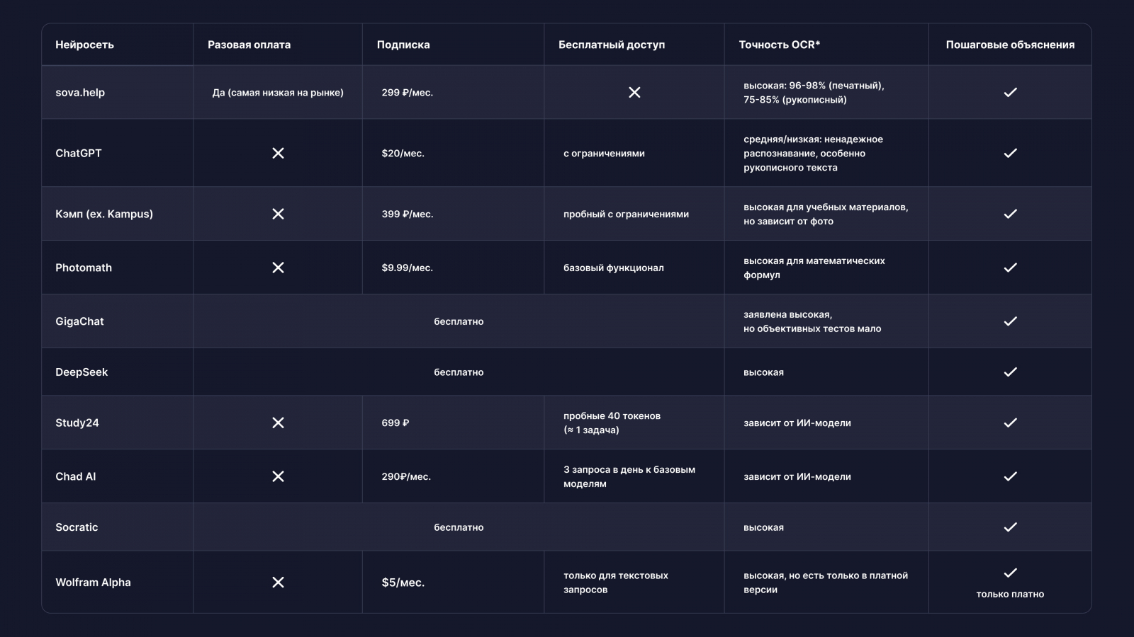 Да, базовые функции с ограничениями бесплатно доступны у ChatGPT (через модель GPT-4o mini), GigaChat, DeepSeek и Socratic. Для регулярного использования более выгодна разовая оплата в sova.help или подписка на месяц за 299 рублей.