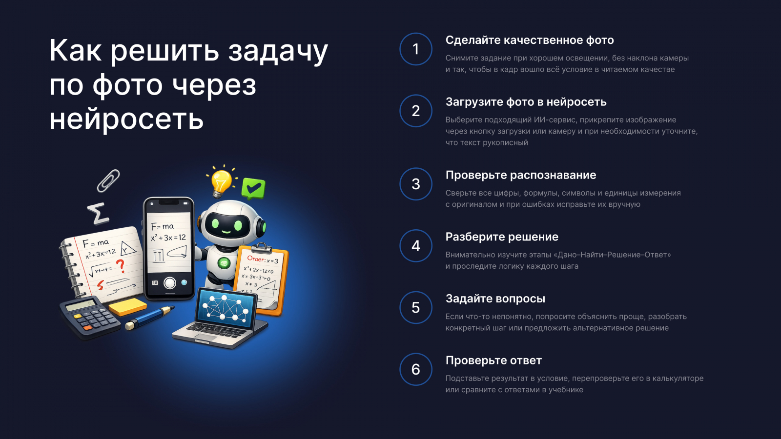Какую бы нейросеть вы ни использовали для решения задач по фотографии, руководствуйтесь осознанным подходом: искусственный интеллект должен развивать критическое мышление, улучшать навыки анализа и углублять понимание научным проблем, а не становится источником для списывания готовых ответов. Тогда нейросети превратятся в вашу надежную опору в образовательном процессе и сделают его эффективным.