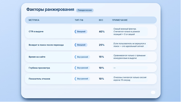 Существует огромное количество мифов про то какие поведенческие факторы учитывает Яндекс. В таблице ниже только реально работающие метрики по данным за 2026 год:
