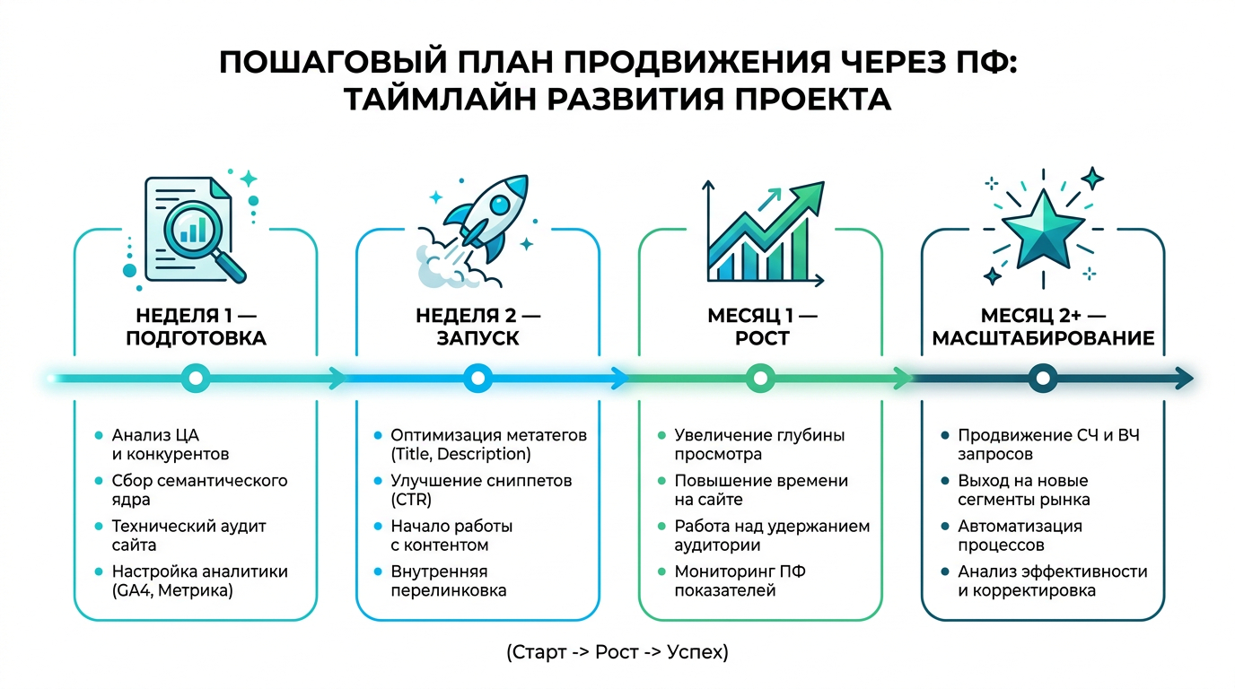 📌 Совет для новых сайтов: Если ваш сайт совсем молодой (менее 2–3 месяцев), сначала добейтесь попадания в ТОП-50 по базовым запросам через контент и техническую оптимизацию. Это как подготовка почвы перед посадкой — без неё даже лучшие семена не взойдут. А накрутка ПФ трафика — это полив, который ускоряет рост уже посаженного растения.