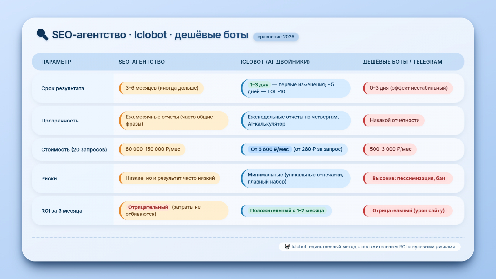 Посмотрите на столбец Iclobot. Стоимость в 15–25 раз ниже агентства, результат — в 10 раз быстрее, а риски — ниже, чем у дешёвых ботов. Это не магия — это технология.
