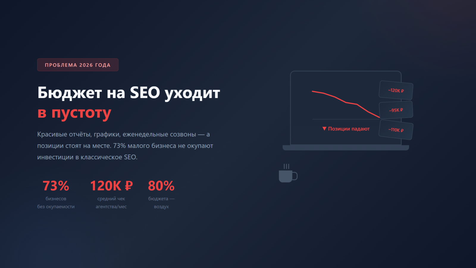 Знакомо? Вы не одиноки. По данным аналитики за 2025 год, 73% малого бизнеса в России не окупают инвестиции в классическое SEO в первый год. Не потому что SEO мертво. А потому что правила игры изменились, а большинство игроков этого не заметили.