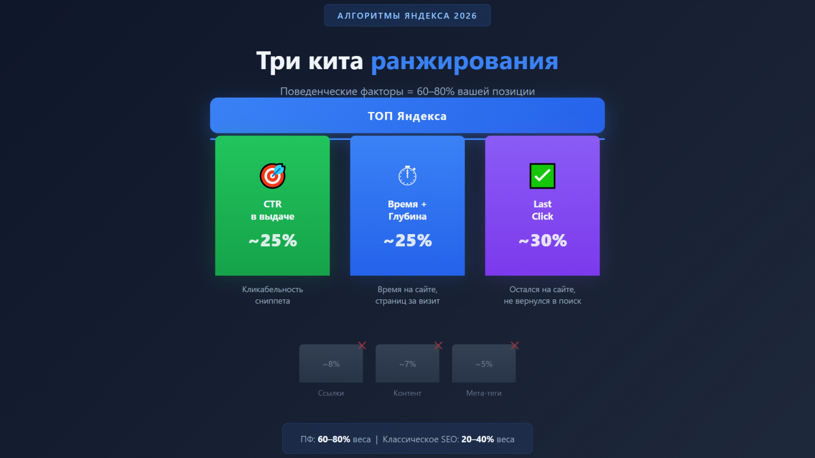Вывод: в 2026 году поведенческие факторы Яндекс — это 60–80% вашего ранжирования. Игнорировать их = игнорировать 80% правил игры.