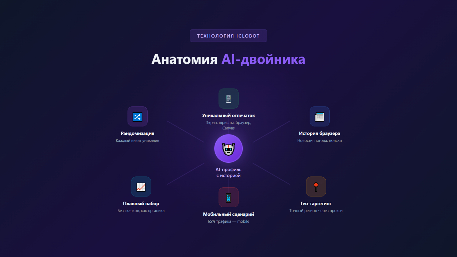 Главный вопрос. И ответ зависит от инструмента. Примитивные боты с одинаковыми отпечатками — да, опасно. AI-двойники с уникальными профилями, историей и плавным набором — безопасно. Iclobot использует собственные прокси-фермы и уникальные цифровые отпечатки для каждого профиля, что делает трафик неотличимым от органического. За всё время работы — ноль случаев бана по AI-профилям.