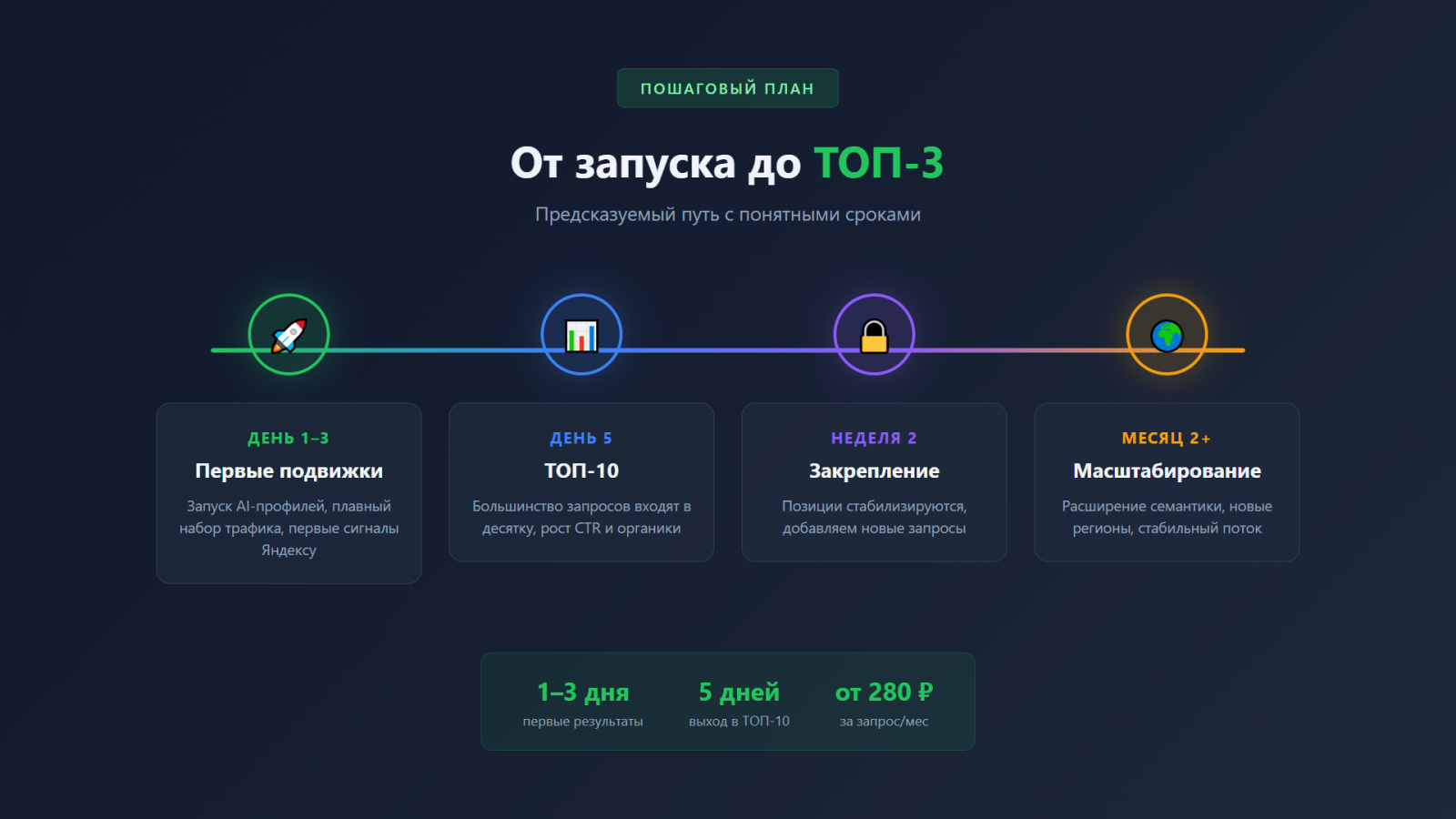 Вывод: путь от запуска до ТОП-3 занимает 2–4 недели для сайтов в ТОП-50. Это не магия — это математика поведенческих факторов.