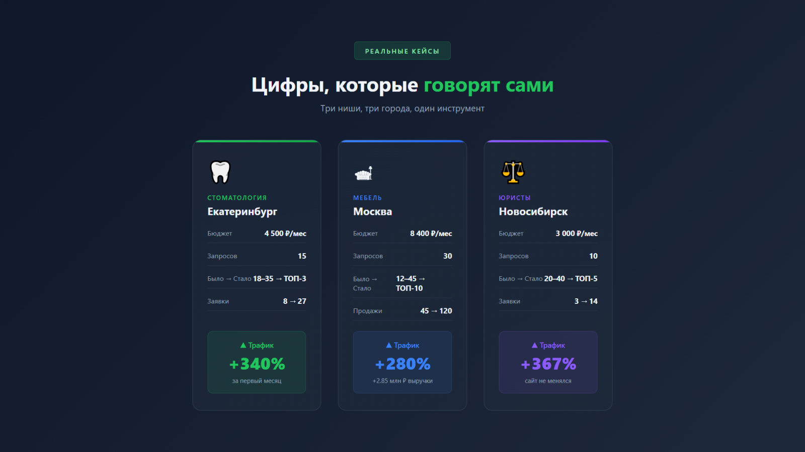 А теперь подумайте о ROI. Допустим, ваш средний чек — 15 000 ₽. Выход в ТОП-3 по 20 запросам приносит, в среднем, 200–500 дополнительных визитов в месяц. При конверсии 3% это 6–15 клиентов. То есть 90 000–225 000 ₽ дополнительной выручки. При затратах 3 000 ₽.