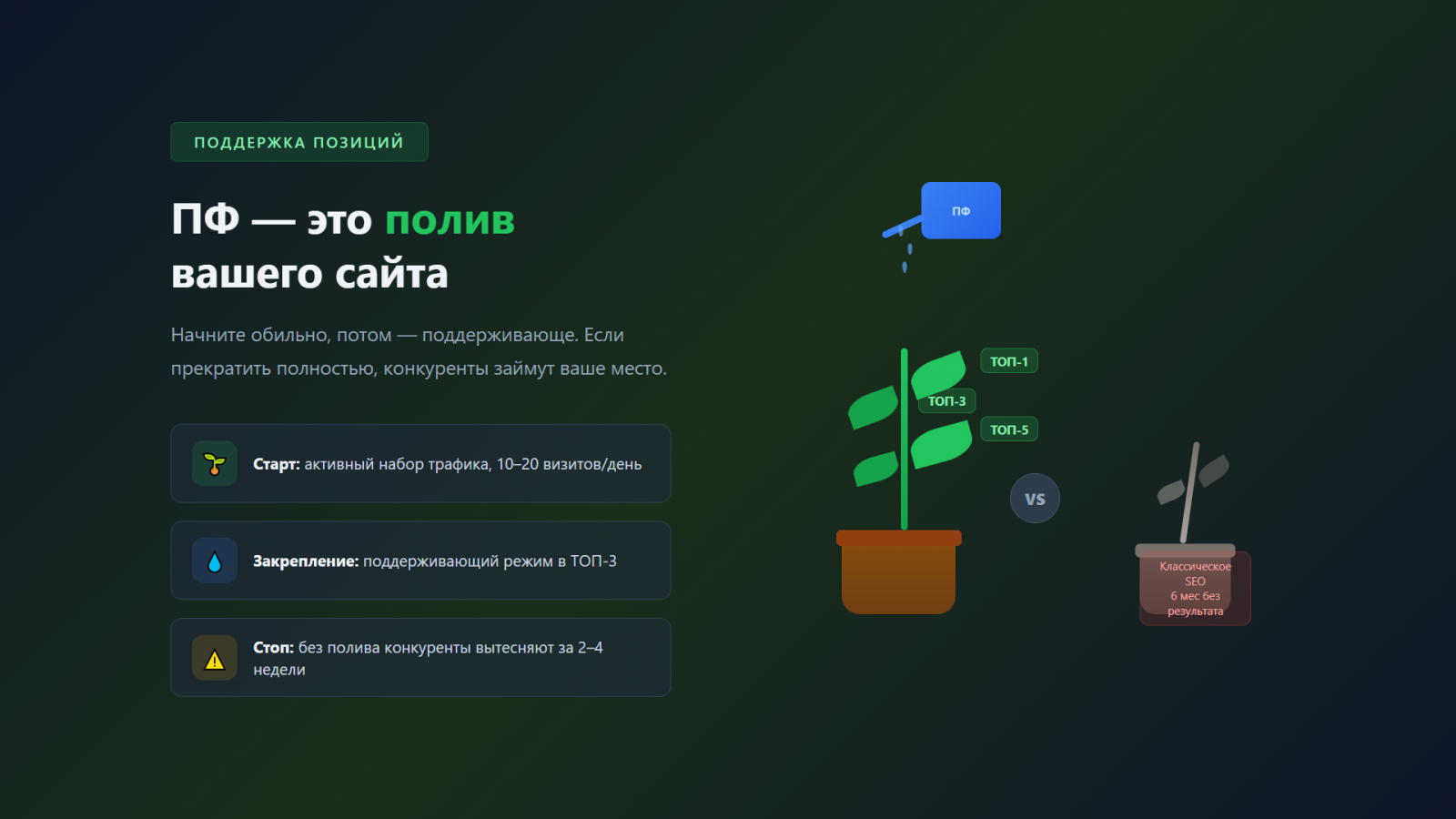 Да, но можно снизить интенсивность. Когда сайт закрепился в ТОП-3, Iclobot переводит кампанию в поддерживающий режим с меньшим объёмом трафика. Это как полив растения: сначала обильно, потом — поддерживающе. Если полностью прекратить — конкуренты, которые продолжают работать с ПФ, постепенно вытеснят вас.