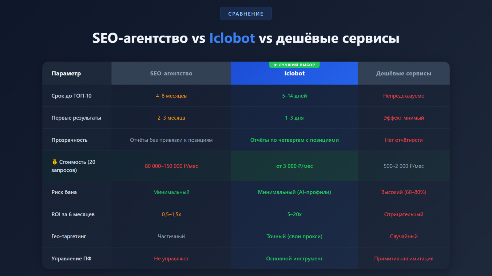 Вывод: Iclobot — это золотая середина между «дорого и медленно» и «дёшево и опасно». Накрутка ПФ — продвижение сайта с предсказуемым результатом.