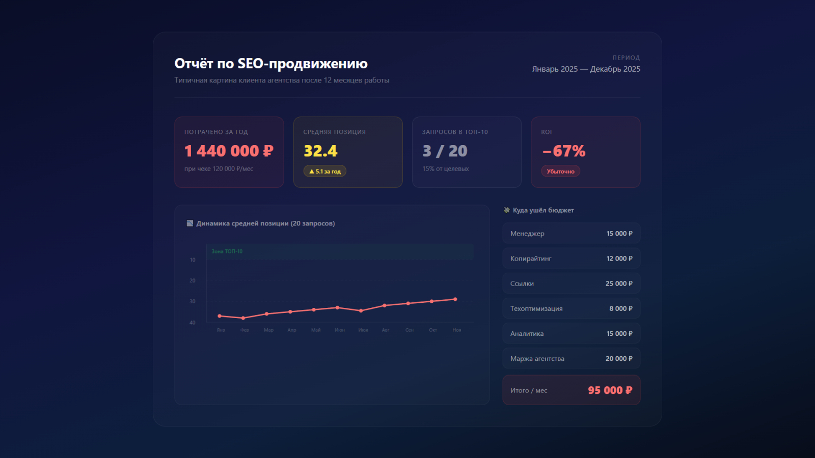 Клиент приходит с запросом: «Хочу в ТОП-5 по 20 запросам». Менеджер кивает, рисует красивую стратегию на три месяца, выставляет счёт на 95 000 рублей.
