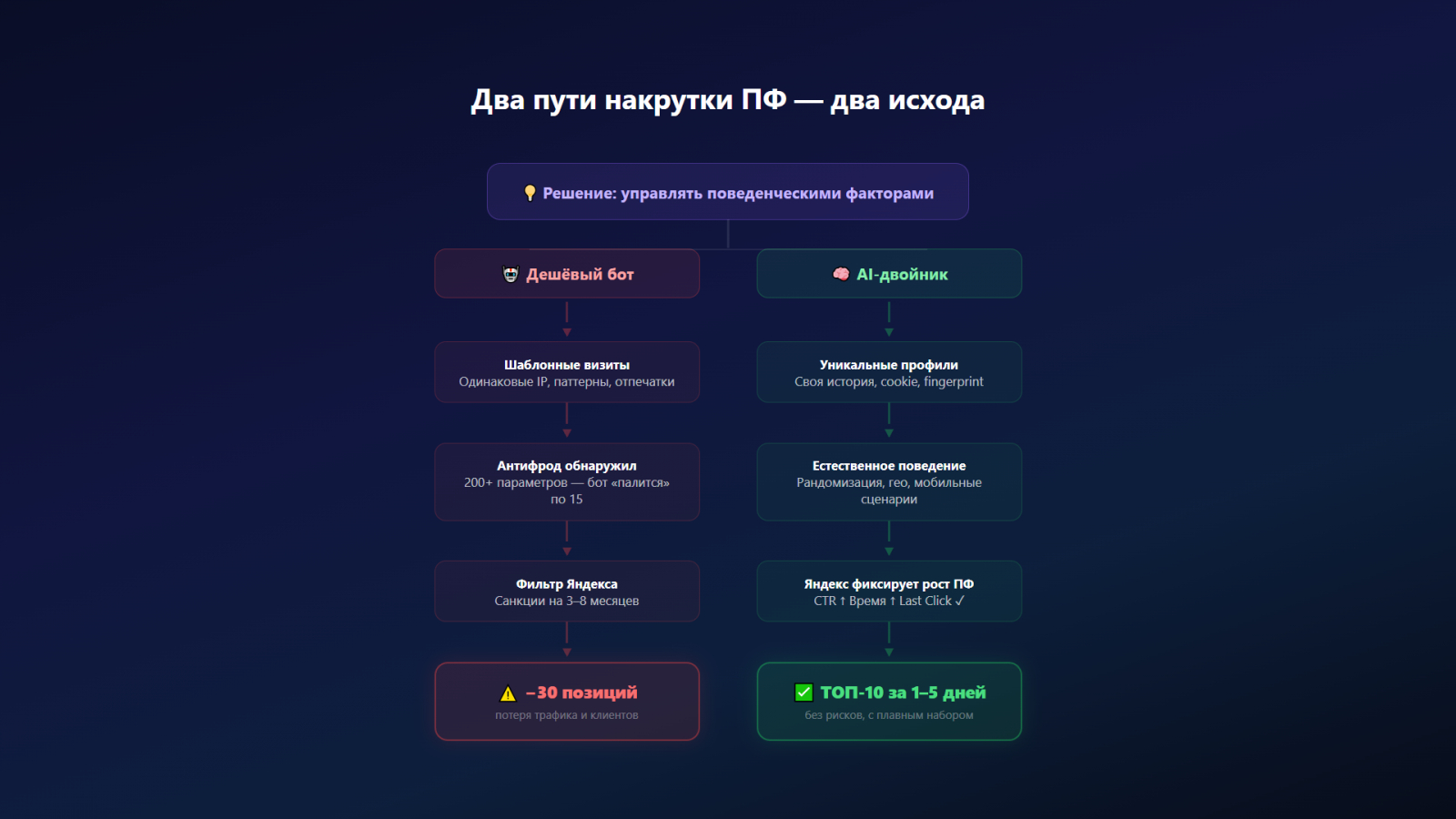 Смотрите какая штука: обычный бот выполняет инструкцию «зайди на сайт, проведи 2 минуты». AI-двойник проживает визит: решает, куда кликнуть, где задержаться, когда уйти. Для Яндекса это неотличимо от живого пользователя, потому что по всем техническим параметрам — это и есть живой пользователь.