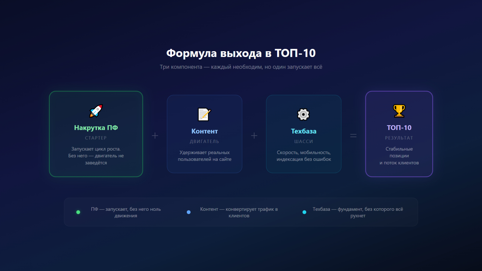 Вывод: план прост и проверен. Сложность — не в действиях, а в выборе правильного инструмента. С правильным инструментом весь процесс от запуска до ТОП-10 занимает дни, а не месяцы.
